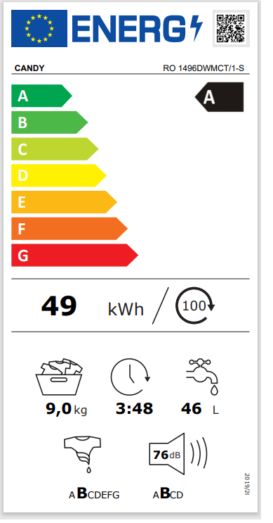 Conforme alla Nuova Etichetta Energetica, questa lavatrice è in classe A. Paragonata a una in classe G, riduce i consumi almeno del 51%, permettendoti di risparmiare energia, denaro e rispettare l'ambiente.
