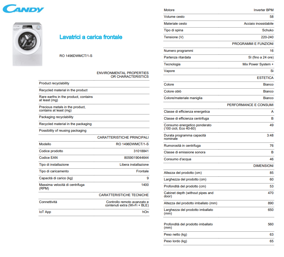 Lavatrice Candy Rapidò WIFI Carica Frontale RO1496DWMCT/1-S 9Kg Classe A