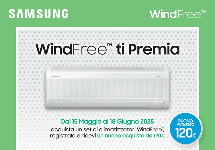 Dal 15 Maggio al 18 Giugno 2025 con i climatizzatori Samsung WindFree™ ricevi in regalo un Buono Acquisto da 120€ da spendere come vuoi sul portale dedicato!